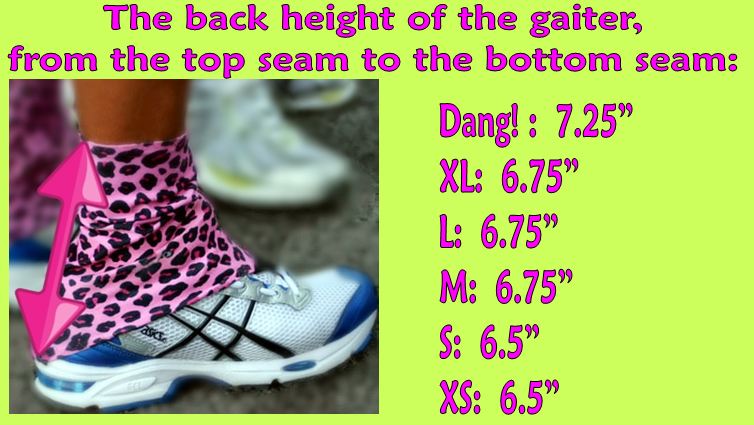XySMALL: Women's shoe size 6-7; (Ankle circumference: 7" - 9.5")SMALL: Women's shoe size 7.5-9, Men's shoe size 6- 7. (Ankle circumference: 7.25"- 10")MEDIUM: Women's shoe size 9.5-11, Men's shoe size 7.5 - 9. (Ankle circumference: 7.5"- 10.25")LARGE: Women's shoe size 11.5-13, Men's shoe size 9.5-11. (Ankle circumference: 8"- 11.5")XyLARGE: Men's shoe size 11.5-13. (Ankle circumference: 8.5"- 12")DANG!: Men's shoe size 13.5 plus. (Ankle circumference: 9"- 12.5")Each DIRTY GIRL GAITER size is associated with an upper ankle circumference. approximately 1-1/2 inches (1.5 inches) above the ankle bone. The fabric is very stretchy, so there is a wide range of ankle sizes that can be accommodated comfortably.However, If your upper ankle circumference is not within the range of the Dirty Girl Gaiter size, this product may not be suitable for you.Ordering by your upper ankle circumference, regardless of your SHOE size, WILL NOT RESULT IN A PROPER FIT! The DIRTY GIRL GAITER will not fit properly over the body of your shoes if you disregard the shoe size when ordering.We are sorry but we are no longer able to provide custom sizes or customized upper ankle circumferences. Please don’t hate us.